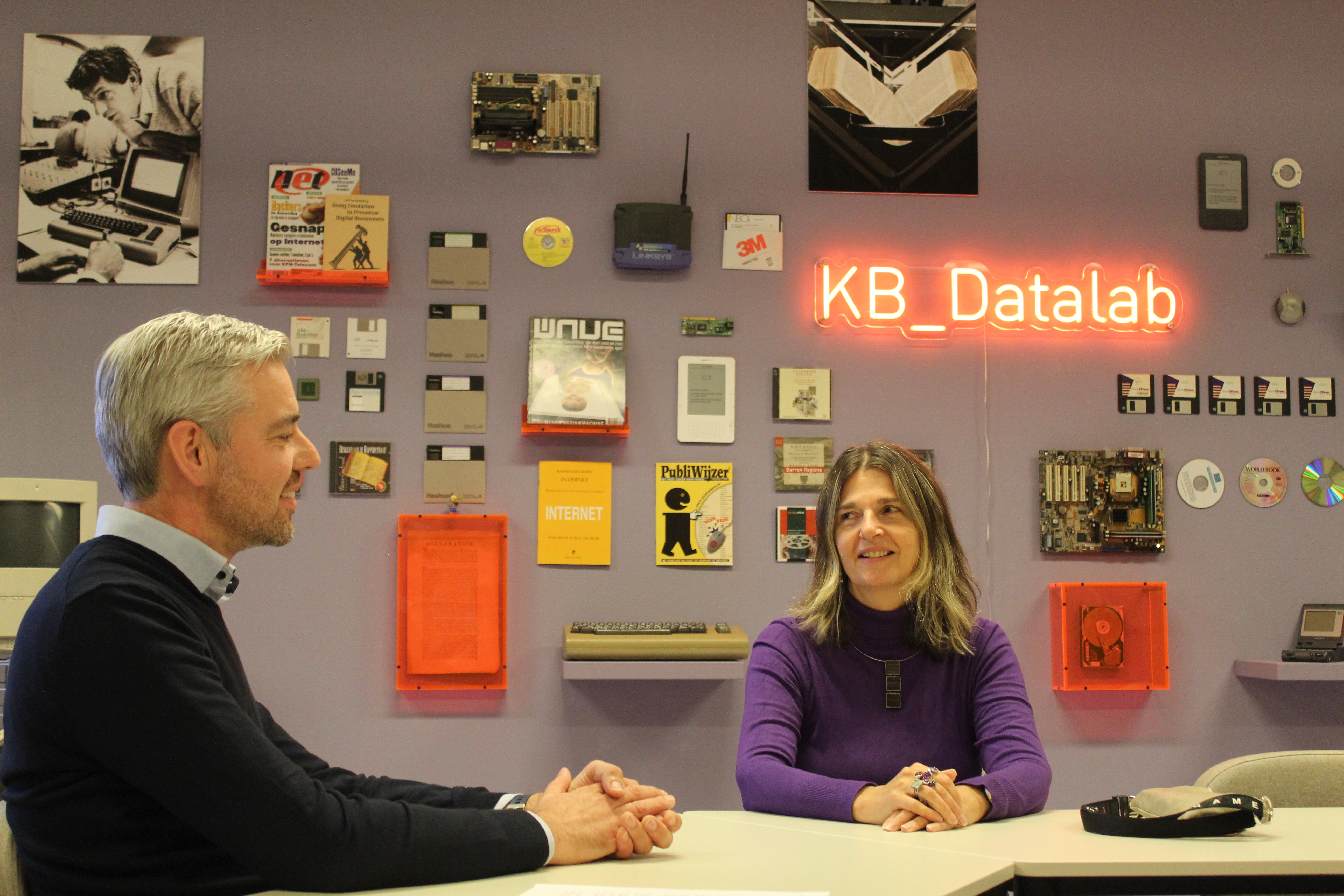 I meet Jeffrey in the KB_Datalab, a physical area in the KB where researchers can work with data files on a secure computer. The wall is decorated with old data carriers such as floppy disks, CD-ROMs and tape cartridges. Their presence immediately underscores what makes Jeffrey's work so tricky; how do you maintain the accessibility of digital publications stored in files when the way they are stored keeps changing?