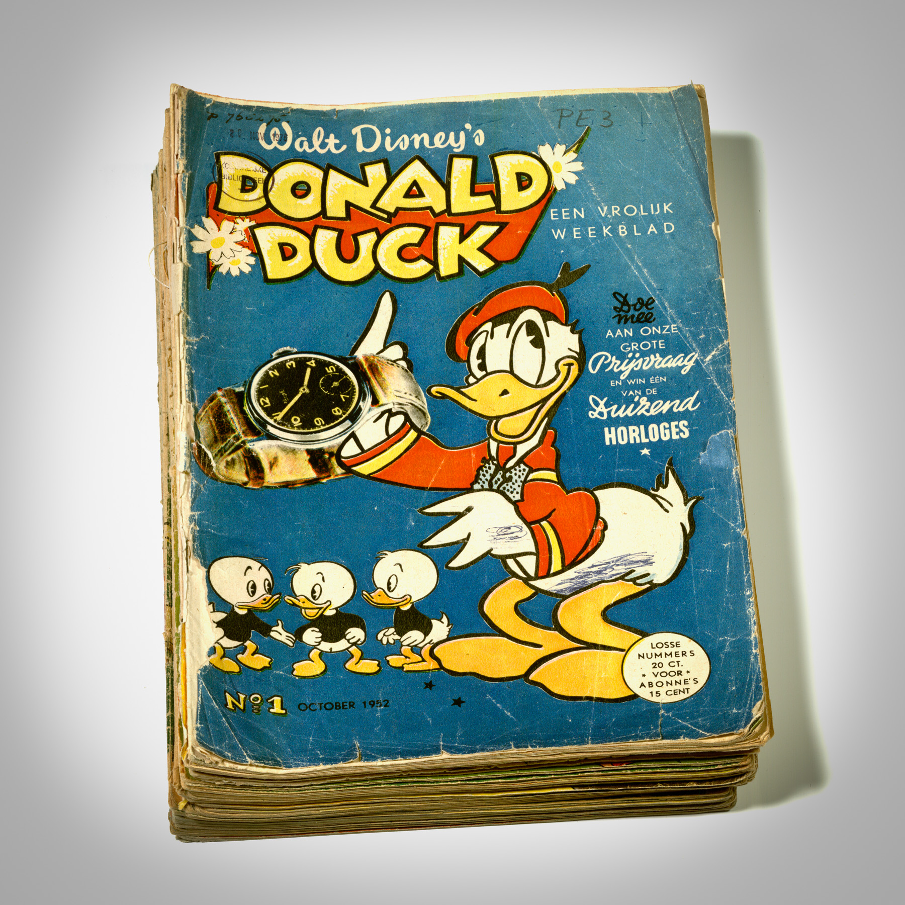 Het weekblad Donald Duck kwam in Nederland voor het eerst uit in oktober 1952. Dit eerste Nederlandstalige nummer werd in 2011 door klanten van de KB en het Nationaal Archief gekozen tot het ‘topstuk met de grootste historische X-factor’. Ondanks veel discussie op Twitter, won de Donald Duck het van de Grondwet van 1848 en het Plakkaat van Verlatinge van 1581. Lees meer over dit bijzondere nummer.