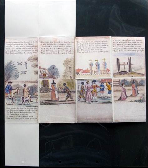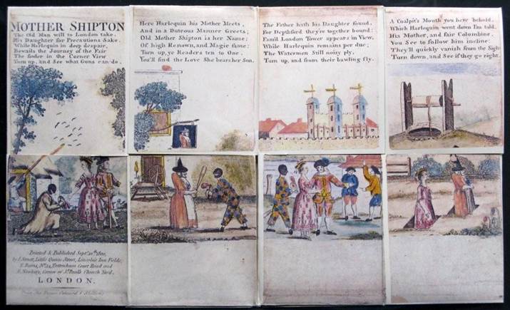 De Londense uitgever Robert Sayer maakte vanaf 1765 ‘turn-up books’ die speciaal gericht waren op vermaak. De illustraties konden mee veranderen met het verhaal. Deze publicaties bestaan uit 1 vel papier dat in vieren gevouwen wordt en dan opengesneden, zodat er 2 rijen flappen ontstaan die geopend en gesloten kunnen worden. Deze vorm wordt ook wel ‘harlequinade’ genoemd, naar de toneelstukken met avonturen van Harlequin die vaak het onderwerp waren voor dit soort uitgaven.