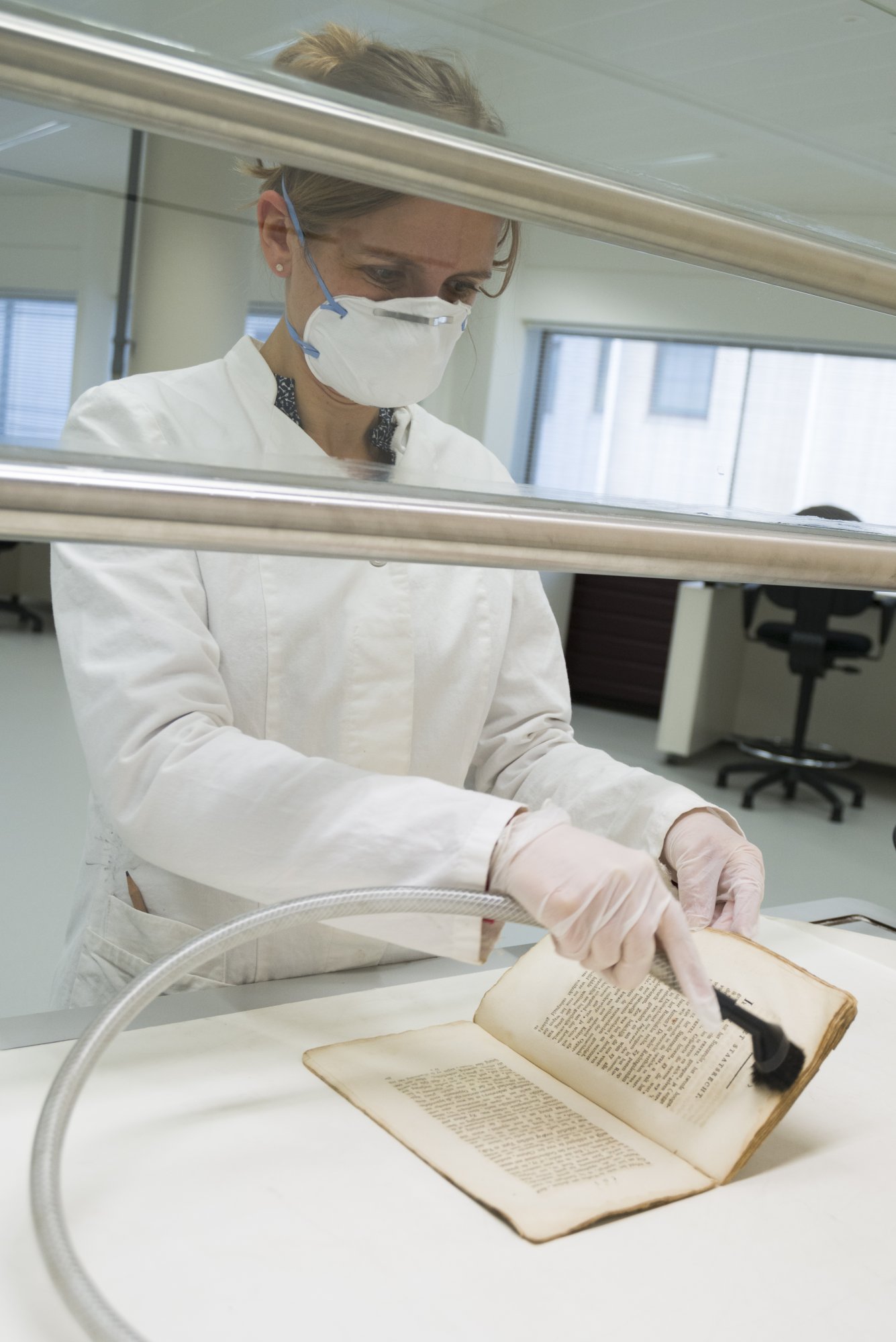 Bij de KB doen we ons best om ervoor te zorgen dat een boek geen schade oploopt. Dat doen we door preventieve conservering, onder meer door boeken veilig te bewaren, op te slaan en schoon te houden. Ook zorgen we ervoor dat een boek zo veilig mogelijk wordt geraadpleegd, bijvoorbeeld door het op een kussen te leggen wanneer je het bekijkt. Preventieve conservering is een expertise van de KB.