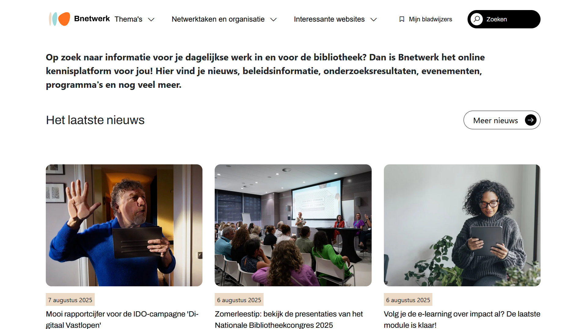 In Nederland zijn meer dan 100 zelfstandige bibliotheekorganisaties. Zij willen allemaal hetzelfde: zorgen dat Nederland een leven lang kan leren én lezen. Om samen te werken als netwerk aan de maatschappelijke opgaven, is kennisdeling erg belangrijk. Bnetwerk is de online plek voor informatie, tools en kennisdeling voor het bibliotheeknetwerk.